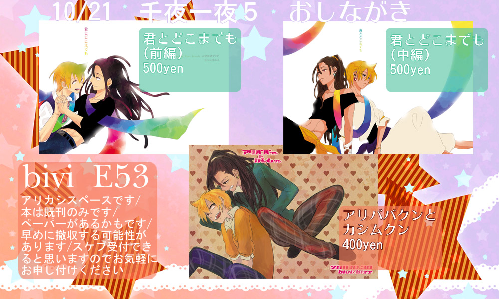 こんばんは、bissです。 今週末6,7日のショタスクとスパークに参加します。 ショタスクスペース F04 スパークスペース ヨ33b です。 新刊は虎太受本になります。 もしかしたら突発コピ本があるかもしれません。 他イナズマ本なども持って行きます。 ご用の方はお気軽にお声かけください^^ それでは…! |